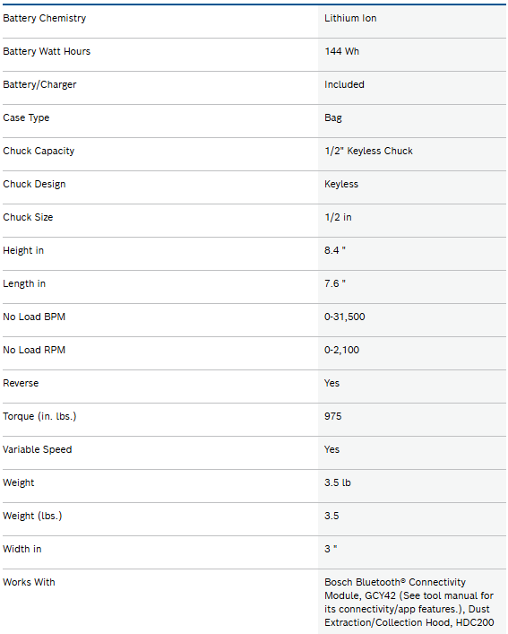 This Bosch hammer drill/driver delivers next-gen innovation with power for demanding materials and applications anywhere on a jobsite. This GSB18V-975C 18V Brushless Connected-Ready 1/2 In. Hammer Drill/Driver has a powerful brushless motor, that provides efficient power for up to 975 In.-Lbs. of max torque and 0-31,500 beats per minute (bpm), but weighs only 3.4 Lbs. (tool only, not including battery). It has variable speed settings: high speed (0-2,100 rpm) and high power (0-480 rpm) and a precision clutch with 25 settings to reduce fastener damage. Rapid mode selection switches between drilling mode and driving mode without needing to adjust the clutch. The drill/driver has KickBack Control, which reduces the risk of injury from sudden rotational torque reaction in a bind-up scenario. The drill features connectivity (module sold separately), which links users to a connected device via the Bosch Toolbox App to customize settings and receive feedback. It has an all-metal chuck that provides durability and a longer belt clip for a more secure hold. The kit features two CORE18V 4 Ah Advanced Power Batteries, allowing you to keep the power and lose the weight.