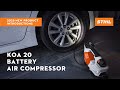 The STIHL KOA 20 battery compressoris easy to use. For versatile applications, you can make various settings on the KOA 20 via theHMI displaythat is easy to see from above. For example, you can choose between the high-pressure function and the volume function at the touch of a button, set the desired pressure and check the charge level of the battery. During the inflation and deflation process, therubber feetof the KOA 20 ensure secure and low-vibrationstability.
